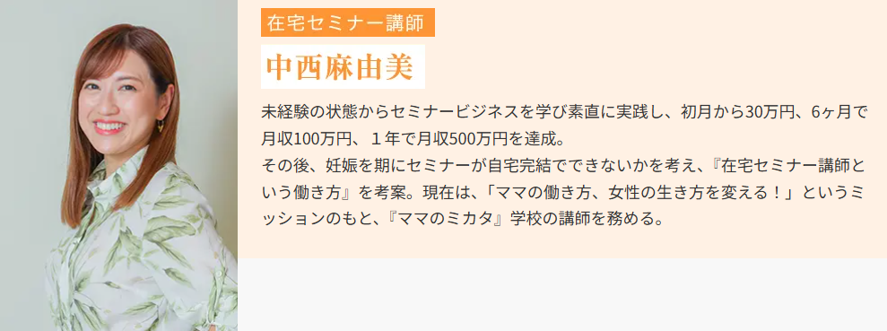 在宅セミナー講師コースを担当している中西麻由美さんは、まさに頼れる先輩ママという印象でした。