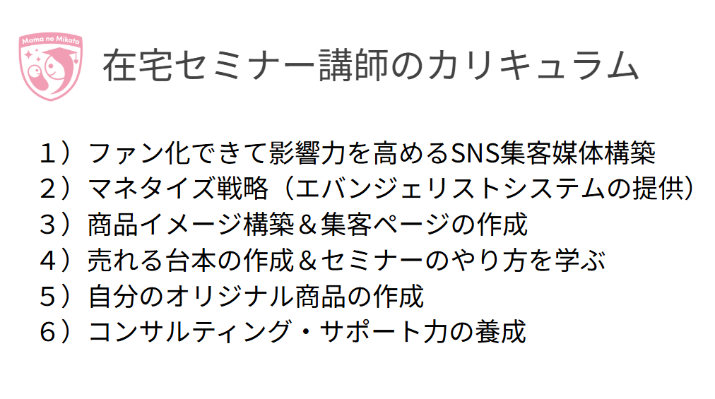 ママのミカタ学校は、ママが家にいながら収入を得られるように設計されたスクールです。特徴的なのは、3つのカリキュラムを同時に学べること。