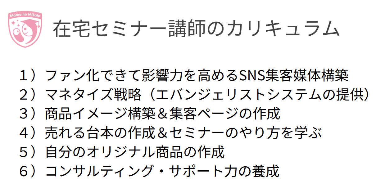 ママのミカタ学校は、メルカリ・WEBデザイン・在宅セミナー講師の3本柱に加え、SNS運用やライティングも学べるのが特徴。