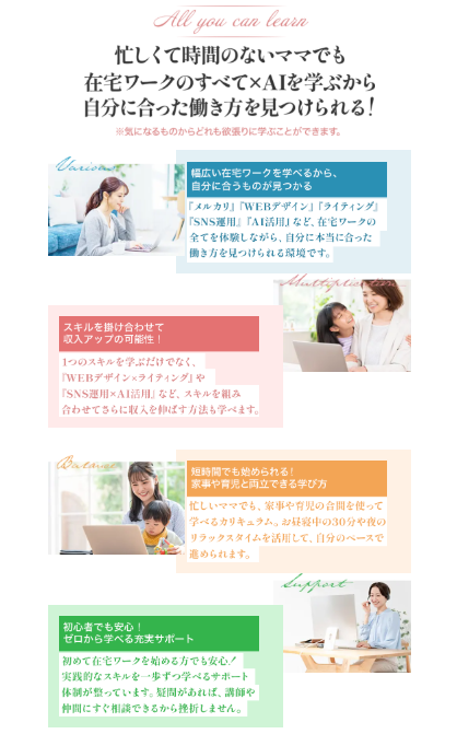 さらに、最先端のAIを活用して作業を効率化できるので、子育てや家事の合間でも結果を出しやすい仕組みです。