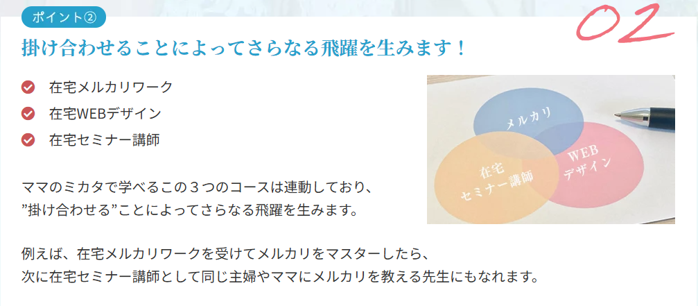 ママのミカタ学校では、メルカリ、WEBデザイン、在宅セミナー講師といった複数の分野を学べます。