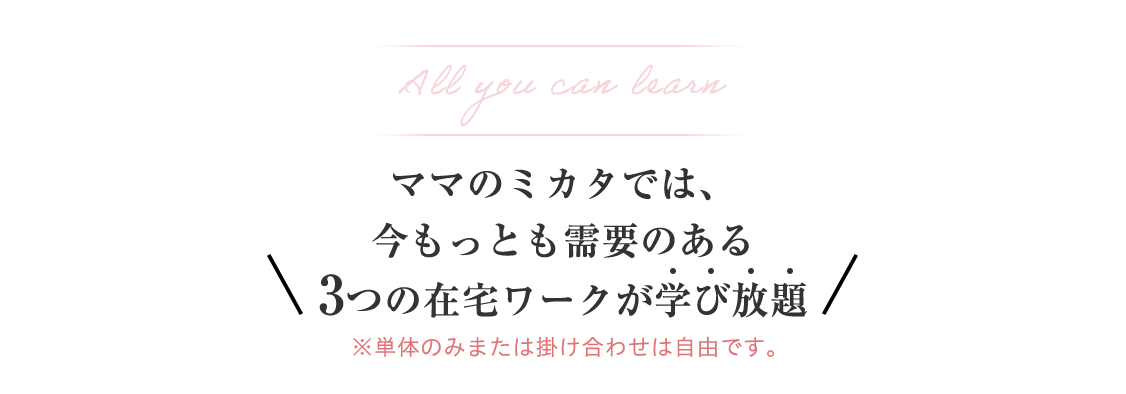 ママのミカタ学校では、「在宅ワークをしたいけれど、どこから始めたらいいかわからない」という声に応えるために、3つのカリキュラムが用意されています。